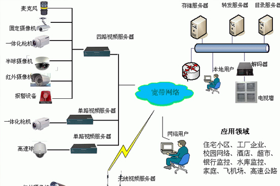 視頻監控系統:監控系統是由攝像、傳輸、控制、顯示和記錄登記5大部分組成。攝像機通過同軸視頻電纜將視頻圖像傳輸到控制主機,控制主機再將視頻信號分配到各監視器及錄像設備,同時可將需要傳輸的語音信號同步錄入到錄像機內。過控制主機,操作人員可發出指令,對云臺的上、下、左、右的動作進行控制及對鏡頭進行調焦變倍的操作,并可通過控制主機實現在多路攝像機及云臺之間的切換。利用特殊的錄像處理模式,可對圖像進行錄入、回放等操作,使錄像效果達到最佳。
